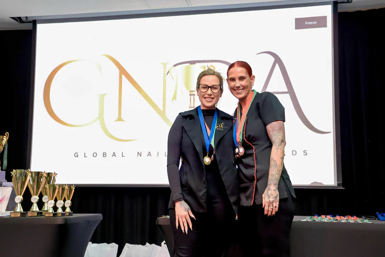 Pictured Award Winning & Gold Medalist Artists: CEO & Founder Krielynd Gaudry alongside Rosie Morrish at Awards Ceramony of Global Nail Design Awards (c) 2025.